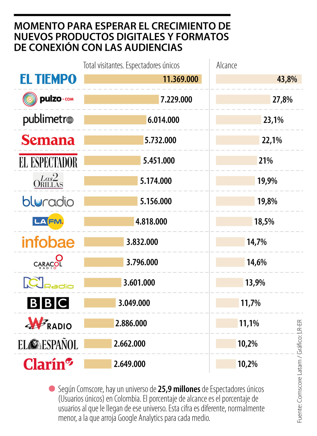 Allí, en el noveno lugar aparece con 3.832.000 ‘Espectadores Únicos’ un recién ‘aparecido’ en el mercado local colombiano que ya tiene el 33 % del tráfico de eltiempo.com, el 53 % del tráfico de Pulzo.com, el 66 % del tráfico de Semana.com y el 70 % del tráfico de Elespectador, cálculo basado en sus ‘Usuarios Únicos’. Tráfico suficiente como para estar ya sobre Caracol Radio y RCN Radio.