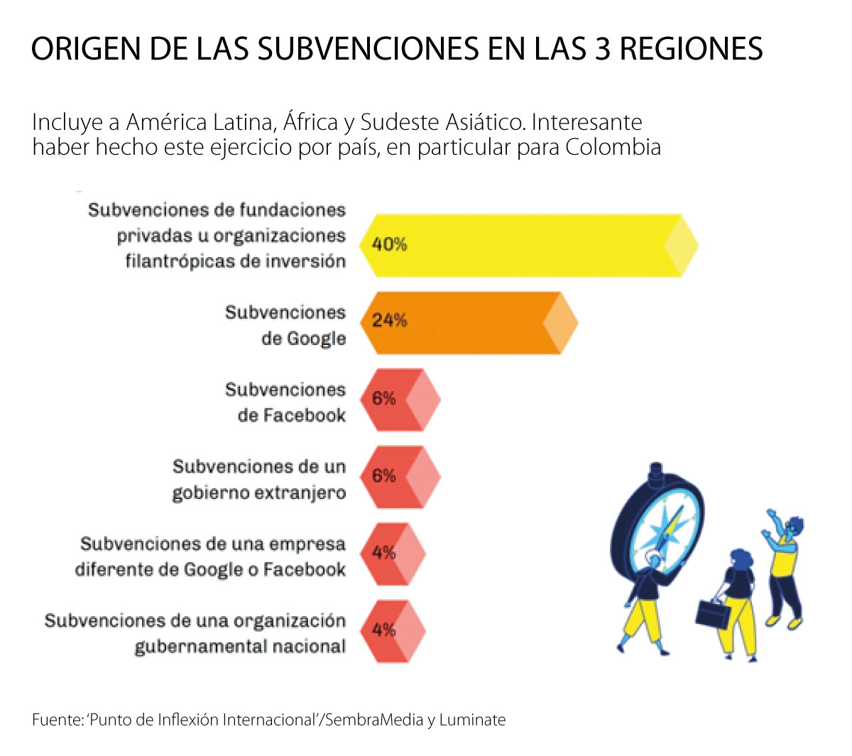 El dato de la dependencia de las subvenciones (ayudas económicas de diferentes fuentes nacionales y extranjeras) es uno de los pocos referidos explícitamente a Colombia ofrecidos por esa investigación, cuyo título, cobertura y metodología promete más de lo que entrega o, dicho de otra manera, tiene un alcance muy limitado para el conocimiento de los nativos digitales de los países medidos, en particular los colombianos, objeto de nuestro interés. Esto porque la mayoría de los datos, conclusiones o recomendaciones están referidas a promedios generales o por región (África, Sudeste Asiático o América Latina, cuya validez, dicho sea de paso, puede ser cuestionada por el número y la representatividad de los países seleccionados, en particular para ‘América Latina’, como se plantea más adelante, así como por los criterios de selección los que participaron en Colombia).