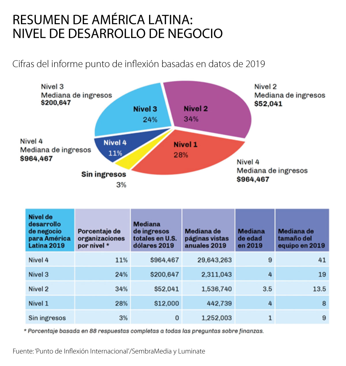 Nivel 4: Los medios en este nivel llegan a millones de usuarios cada mes y generan más de USD $500.000 al año (algunos ganan más de un millón). La mayoría de los medios en este nivel reportaron audiencias y equipos más grandes, condición que les otorgó el nombre de ‘Destacados’ en nuestro primer informe.