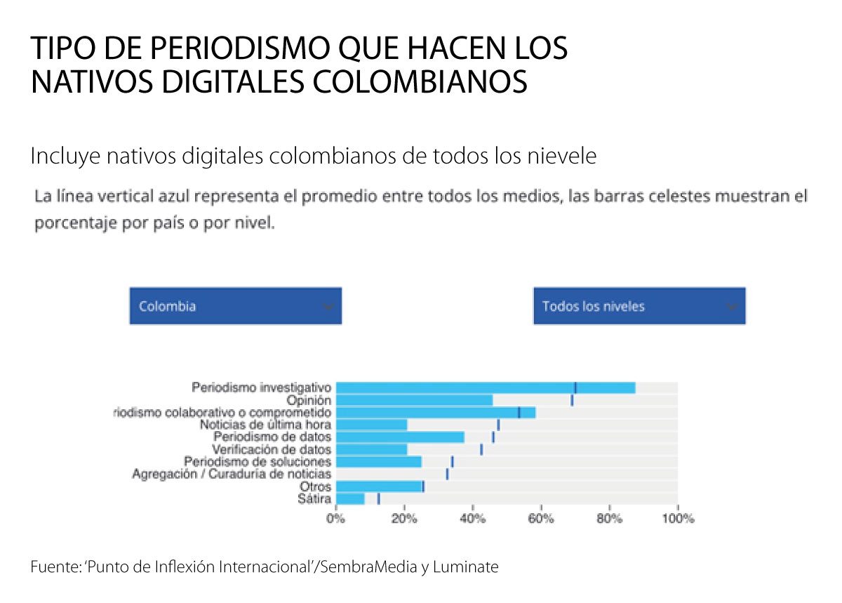 La muestra de medios nativos digitales colombianos incluyó a ‘Actualidad Panamericana’; ‘Agenda Propia’; ‘Baudó, Agencia Pública’; ‘Cartel Urbano’; ‘ColombiaCheck’; Connectas; ‘Cuestión Pública’; ‘Elcampesino.co’; ‘La Cola de Rata’; ‘La No Ficción’; ‘Or’; ‘La Silla Vacía’; ‘Las 2 Orillas’; ‘Los Danieles’; ‘Mutante’; ‘Pacifista ¡’; ‘Razón Pública’; ‘Rutas del Conflicto’; ‘Seguimiento.co’; ‘Cero Setenta’; ‘Sentiido’; ‘Tüü Pütchika, La Palabra’: ‘Verdad Abierta’; ‘Vokaribe’; y ‘Vorágine, Periodismo Contracorriente’.
