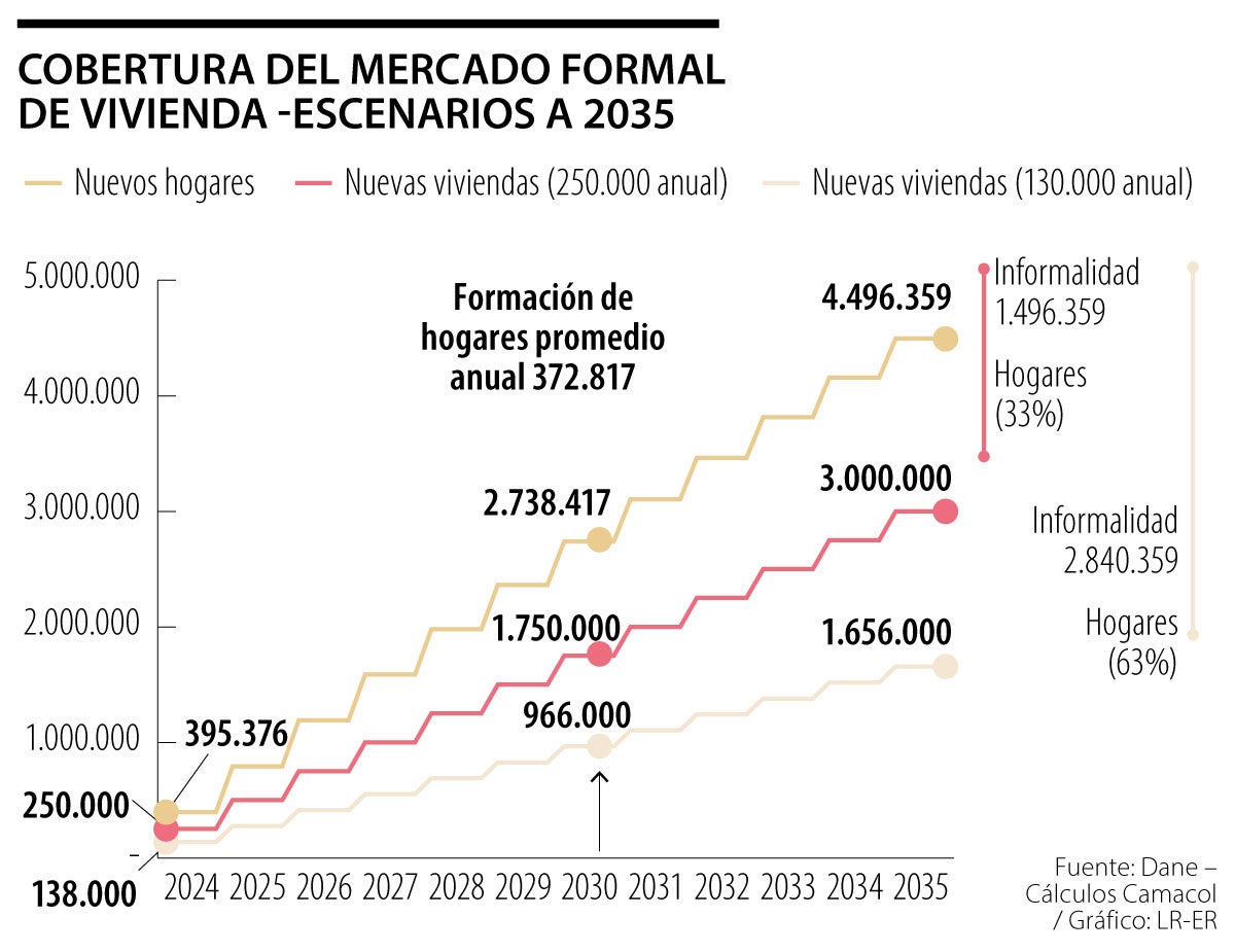 Así las cosas, el sector debe asumir el reto de incrementar el ritmo de construcción a por lo menos 250.000 viviendas anuales. Esta meta, además de tener importantes impactos en el PIB y en la generación de empleo, permitirá pasar de tener una cobertura del mercado formal, equivalente a cinco de cada 10 viviendas construidas actualmente, a casi 7 de cada 10 viviendas, con la construcción 3 millones de vivienda formales a 2035.