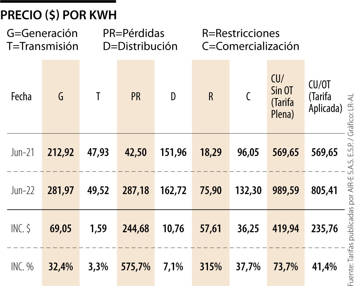 Hoy la tarifa ha incrementado $419,94 por kilovatio-hora, lo cual representa 73,7% más de lo pagado hace un año. Si bien todos los componentes del costo han sufrido alzas que deben ser atendidas estructuralmente, ninguna ha sido tan significativa como el valor que se le cobra al suscriptor de la región caribe por las pérdidas, con un incremento de $244,68, es decir, 575,7% adicional a lo que pagaba hace un año por ese mismo concepto.