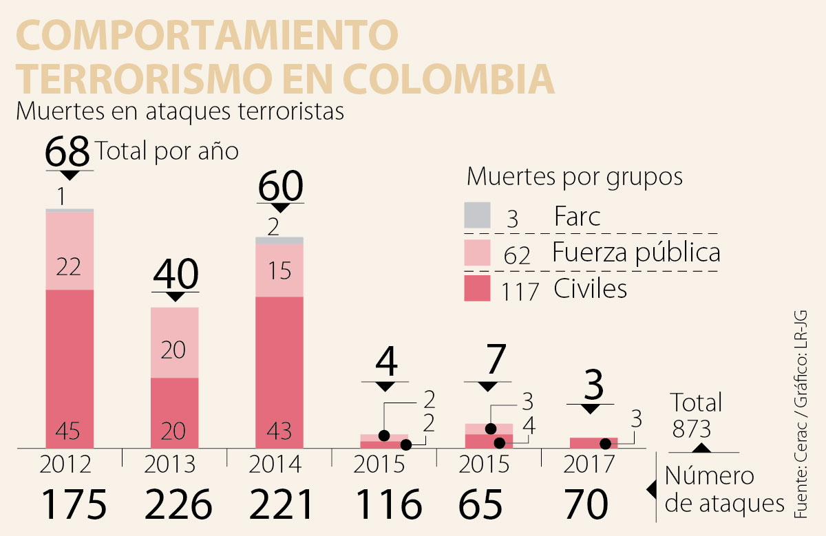 Los atentados terroristas -acciones violentas indiscriminadas- se han reducido sustancialmente en años recientes. El número de ataques de tipo terrorista registrados por Cerac, muestra por ejemplo una caída del 69% de 2013 a 2017. Los datos del Ministerio de Defensa muestran una caída del 86% en actos de terrorismo (890 actos de terrorismo en 2013 a 124 en el 2017). El leve aumento en este último año se debe, exclusivamente, a acciones del ELN en las aisladas y distantes áreas donde opera.