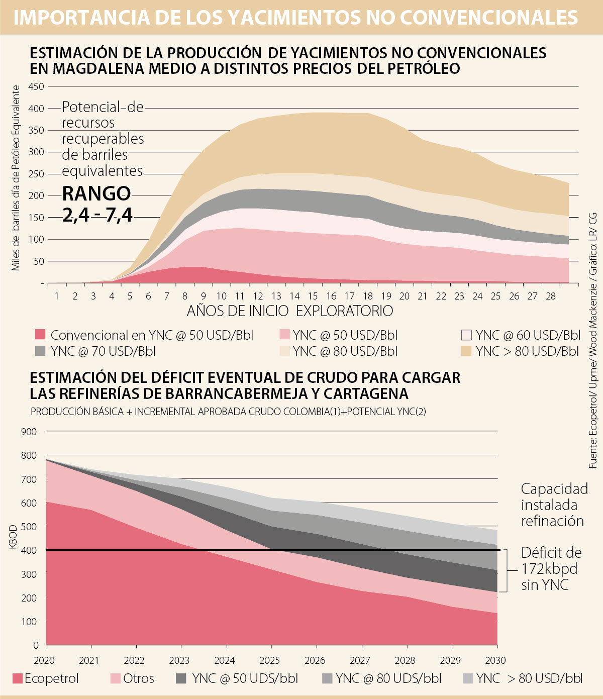 En un escenario conservador, y con un precio entre US$60 y US$80 por barril en la próxima década, y con tecnología de punta, el potencial de producción en los YNC podría llegar a 250.000 barriles de petróleo equivalente por día. Su desarrollo demandaría inversiones entre US$15.000 millones y US$40.000 millones en los próximos 25 años. Ello dinamizaría la economía del Magdalena Medio y del país.