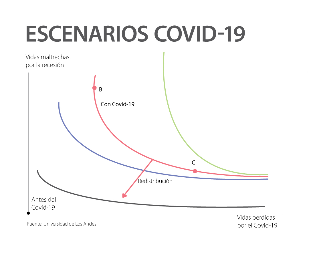 Segundo, debemos admitir que navegamos parcialmente en tinieblas. Basta comparar las estimaciones del impacto de esta crisis de la Universidad de los Andes con las sustancialmente mayores de Fedesarrollo. Para algunos el mundo se ve como la línea verde: cada vida que intentemos salvar por el virus es un sacrificio enorme en el bienestar material de muchos. Otros lo estiman como la azul, con menor impacto por la recesión por cada vida salvada del Covid.