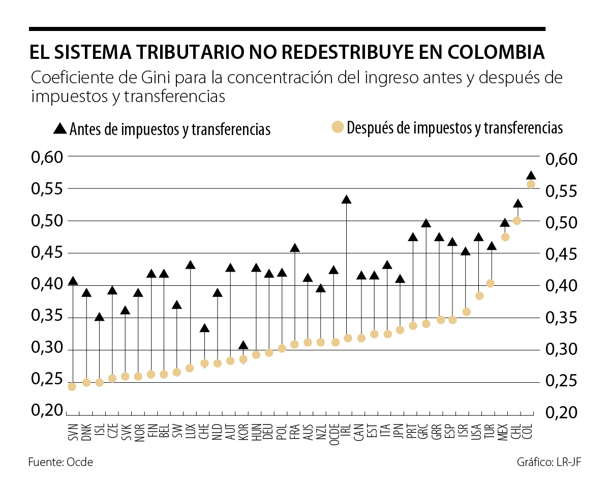 Primero, la desigualdad. Colombia es uno de los países más desiguales del mundo. En propiedad de la tierra, está entre los países con mayor concentración de Sudamérica, la subregión más desigual del planeta. En ingreso es también uno de las más desiguales, y sin avances notorios en los últimos 30 años. En movilidad social está rezagado (pese a avances) frente a otros en la región. Y lo más grave es que esta concentración de la fortuna no mejora sustancialmente con la política fiscal.