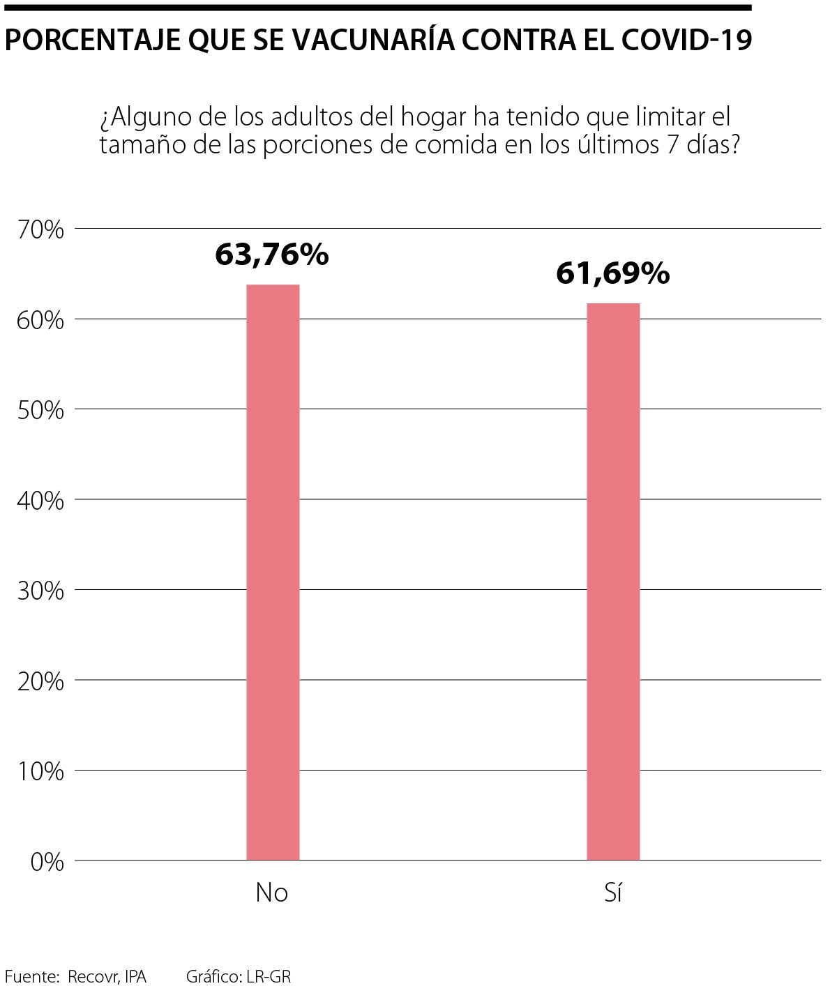 En su más reciente versión (de noviembre de 2020) la encuesta encontró que algo más de 60% de los encuestados afirman que se vacunarían contra el covid-19. Al usar información, de la misma encuesta, sobre si los adultos del hogar han tenido que limitar el tamaño de las porciones de sus comidas en los últimos siete días, se encuentra que quienes no han tenido que limitar sus comidas tienen una disposición ligeramente mayor a vacunarse (63,8%) que quienes sí han tenido que limitar el tamaño de sus porciones al menos una vez al día (61,7%). Si combinamos esta menor disposición con las trabas adicionales que podrían tener las personas vulnerables (por ejemplo, por falta de información, tiempo o dificultades de acceso) la pandemia podría resultar doblemente injusta: la enfermedad, y el remedio, inequitativamente distribuidos.