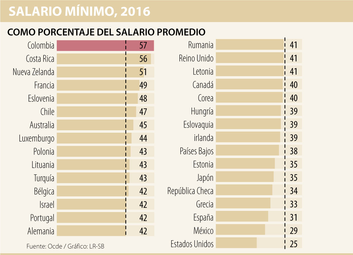 Sin embargo, es muy importante tener presente que el ajuste del salario mínimo no necesariamente implica que todos los salarios en la economía se mueven en la misma dirección ni en la misma magnitud. De acuerdo con los datos de la Organización para la Cooperación y el Desarrollo Económicos (Ocde), el salario mínimo en Colombia representa cerca de 86% del salario mediano y 57% del salario promedio de las personas ocupadas en el país (Gráfico 1). Estos resultados indican que muchos trabajadores reciben remuneraciones inferiores al mínimo legal establecido. Más aún, estas cifras se encuentran entre las más altas del mundo y son superiores a las de todos los países de la Ocde, que son los países más avanzados económicamente. Por supuesto, en términos absolutos, el salario mínimo legal en esos países es considerablemente más alto que el colombiano, pero allí ese salario mínimo legal es efectivamente un mínimo por encima del cual se ubican tanto la productividad laboral como la mayor parte de los salarios. Ello desafortunadamente no es lo que sucede en Colombia.