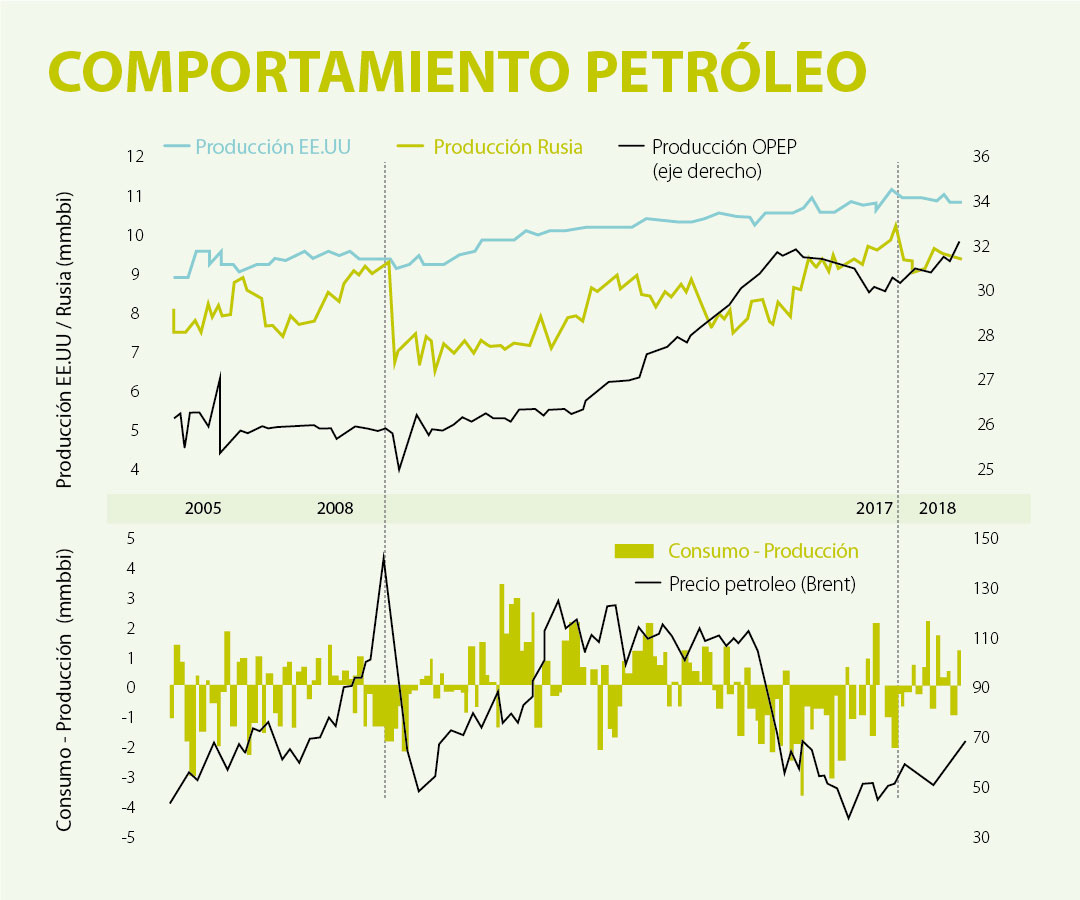 Después de alcanzar su punto más bajo de los últimos años en febrero de 2016, el petróleo ha venido recuperándose gracias al aumento de la demanda y en particular al recorte de producción acordado por la OPEP a finales de 2016. La gran incógnita es cuál será la reacción de los países productores ante el aumento de los precios y cuánto tiempo más podrá mantener la OPEP su acuerdo de recorte.