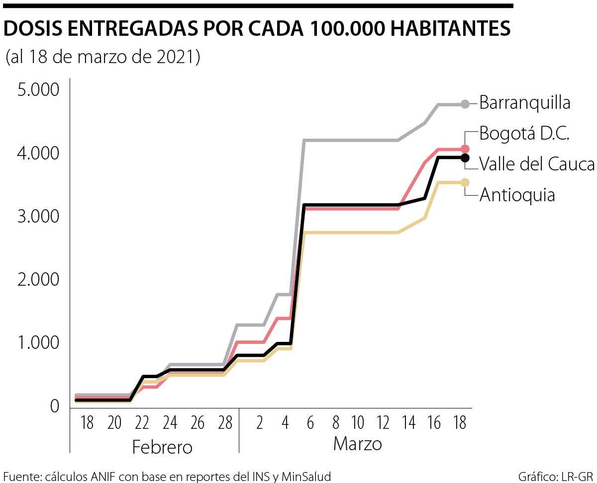 Entre estas cuatro ciudades, Barranquilla es la ciudad con más dosis disponibles para aplicar, al contar con vacunas para más del 4.5% de su población. A pesar de ello, es la más lenta en aplicación, pues apenas ha administrado el 56% de las dosis que le fueron asignadas. En el caso de Bogotá se vio una aceleración en la aplicación de las vacunas el fin de semana pasado, cuando se vacuno a más del 1% de su población. Por esa razón, con corte 18 de marzo, se reportó el uso del 70% de sus dosis, un resultado positivo para la capital.
