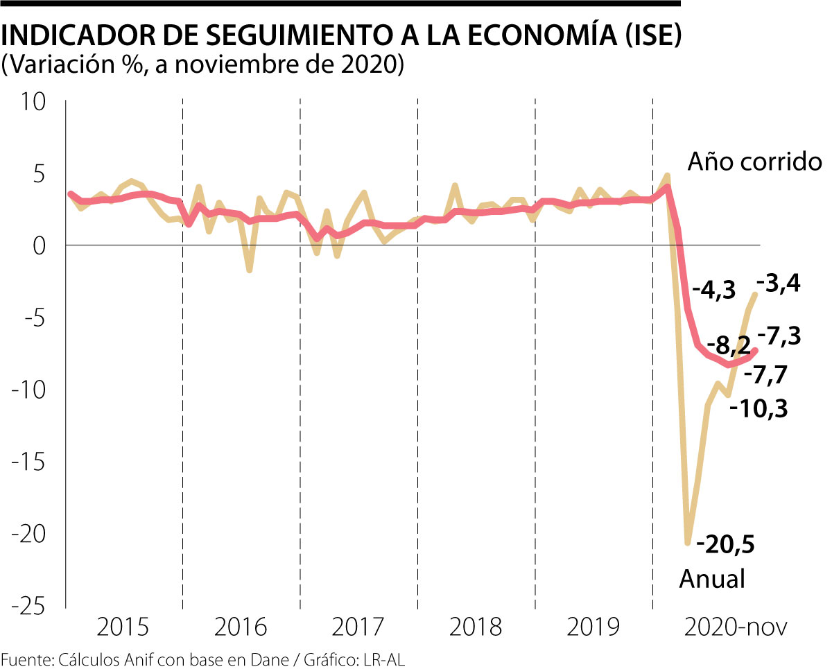 Con el dato de noviembre, el Indicador de Seguimiento de la Economía (ISE) muestra que la senda de recuperación continuaba en consolidación, en línea con lo que esperábamos en ANIF, aunque un poco superior a lo que preveían los analistas consultados por el DANE. En efecto, la variación anual del índice fue de -3.39%, mientras que en la serie para el año corrido el valor fue de -7.25%. Con eso, se ha reversado la tendencia negativa observada desde enero (ver Gráfico 1). Por otro lado, al analizar las variaciones intermensuales (a partir de la senda corregida por efecto estacional y de calendario), se observa una expansión de 1.23% frente al mes de octubre, que resulta ser cerca de un tercio de los crecimientos observados en los dos meses anteriores. En otras palabras, desde los mínimos históricos de abril y mayo ha iniciado un proceso importante, aunque heterogéneo, de reactivación de las diferentes actividades económicas. Cabe decir que la excepción fue el mes de agosto en el que, debido a las medidas restrictivas implementadas, principalmente en Bogotá y Antioquia, se interrumpió la tendencia.