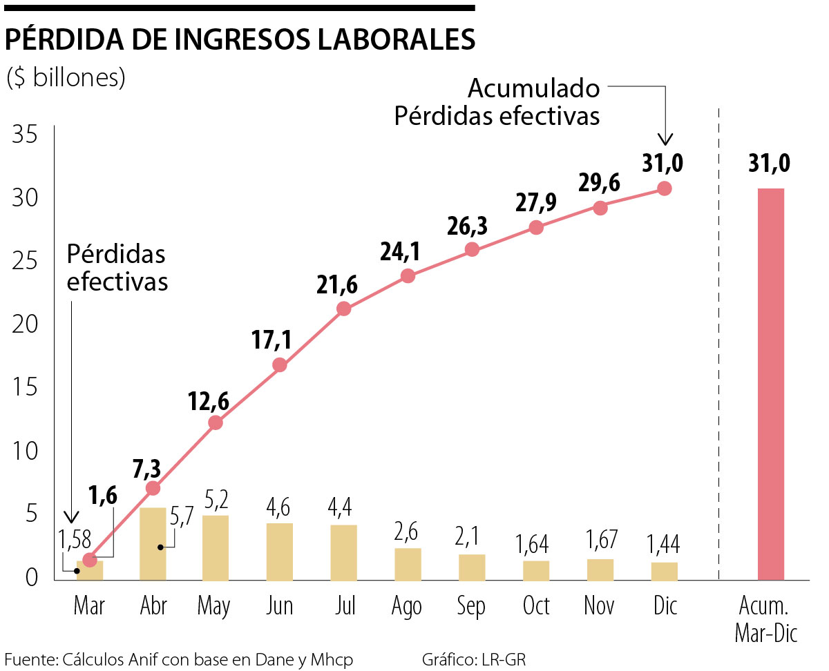 De otro lado, continúa la pérdida de ingresos laborales que, aunque ha disminuido con respecto a los meses más duros del confinamiento obligatorio, se mantiene en niveles preocupantes. Para el mes de diciembre, la pérdida de ingresos laborales de los hogares sumó aproximadamente $1.44 billones, ligeramente inferior al valor registrado el mes inmediatamente anterior ($1.67), así como al presentado al inicio de la emergencia sanitaria en marzo ($1.58). Con lo anterior, el ingreso laboral que los hogares han dejado de percibir entre marzo y diciembre asciende a $31 billones, es decir cerca de 2.9% del PIB.