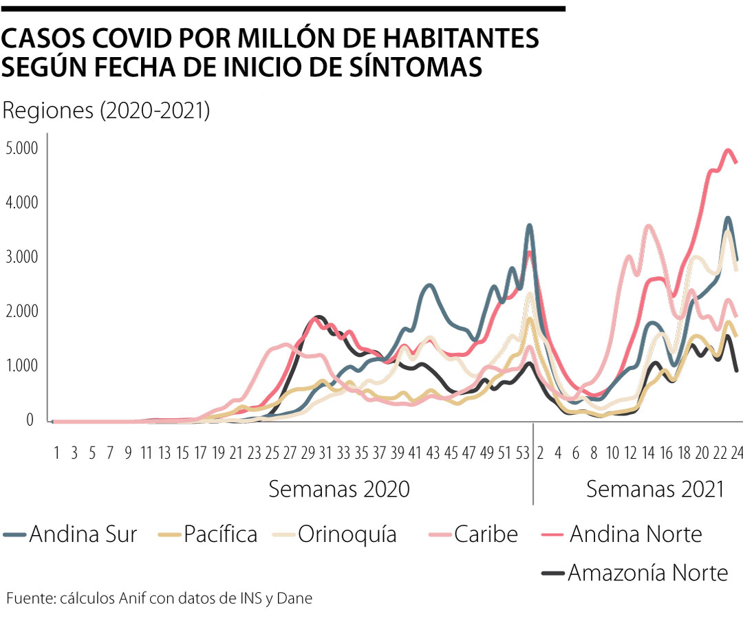 Como hemos mencionado, la situación en todas las regiones parece mostrar por fin señales de mejoría (ver gráfico). Actualmente, nos encontramos cursando la semana epidemiológica 27, de acuerdo con el calendario del Instituto Nacional de Salud. Los datos dejan claro que desde la semana 24 iniciamos la estabilización o descenso del pico. Sin embargo, volvieron a imponerse restricciones a la movilidad ciudadana en 15 departamentos. La decisión es un retroceso a lo que se había logrado mediante la resolución 777 de 20212, con la que se por fin había iniciado un proceso de reactivación estable de la economía. La gran mayoría de los 15 departamentos que están sufriendo nuevas restricciones alcanzó su pico hace varias semanas, de modo que las imposiciones son bastante cuestionables.