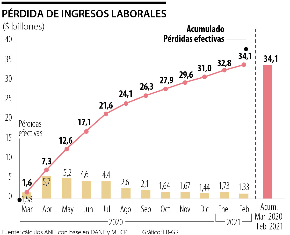 Sumado a eso, la caída de ingresos laborales, aunque fue menor en febrero que en enero ($1.33 billones vs. $1.73), no deja de preocupar. Entre marzo de 2020 y febrero de 2021, el ingreso laboral que los hogares han dejado de percibir asciende a $34.1 billones, equivalentes a 3.3% del PIB aproximadamente.