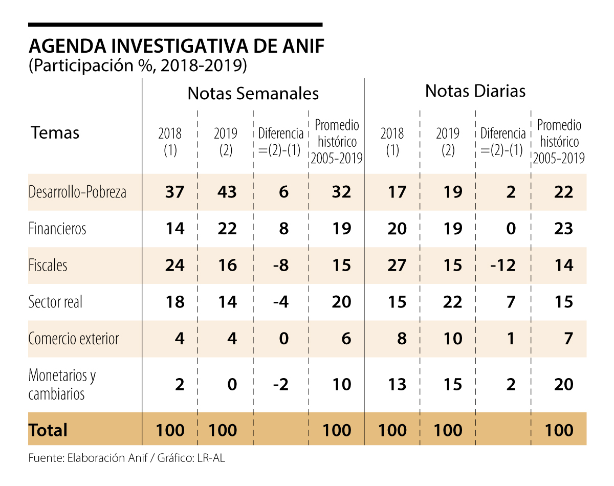 Consistente con lo anterior, a lo largo de 2019, la agenda investigativa de Anif se concentró en los temas de desarrollo-pobreza (incluyendo las aristas sociales y de desigualdad del ingreso) y financieros. En efecto, el 43% de las notas semanales de 2019 se dedicó a los temas de desarrollo-pobreza (superando el promedio histórico del 32% del período 2005-2019), ver cuadro adjunto. A nivel de las notas diarias, estos temas representaron un 19% del total (algo inferior al 22% histórico). Aquí se destacaron los análisis del Plan Nacional de Desarrollo 2018-2022 (ver Informes Semanales No. 1445 de enero y 1468 de julio de 2019) y de los desafíos de competitividad que implica tener una “Economía Encajonada” (ver Informe Semanal No. 1472 de agosto de 2019). Adicionalmente, sobresalen los ejercicios de visión retrospectiva (2005-2019) que realizó Anif sobre sus análisis en diversos frentes laborales-sociales, tributarios-fiscales y de infraestructura, así como sus recomendaciones de agenda pendiente (2020-2022), ver Informes Semanales No. 1485 y 1487 de noviembre y 1489 de diciembre de 2019. Siendo estas notas una suerte de “memorias” del cierre de la Dirección del Dr. Sergio Clavijo durante 2005-2019.