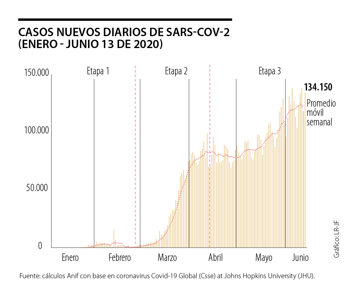 Después de ese incremento sustancial, inició la tercera etapa con la expansión masiva en Estados Unidos, que se convirtió en el país del mundo con el mayor número de contagios. Desde un valor máximo de 102.000 casos diarios el 24 de abril, la evolución de esta variable muestra un crecimiento con caídas y crecimientos irregulares. De hecho, la tasa de crecimiento diaria hasta mediados de junio fue del 19%, sustancialmente menor, a pesar del severo incremento de Estados Unidos durante mayo.
