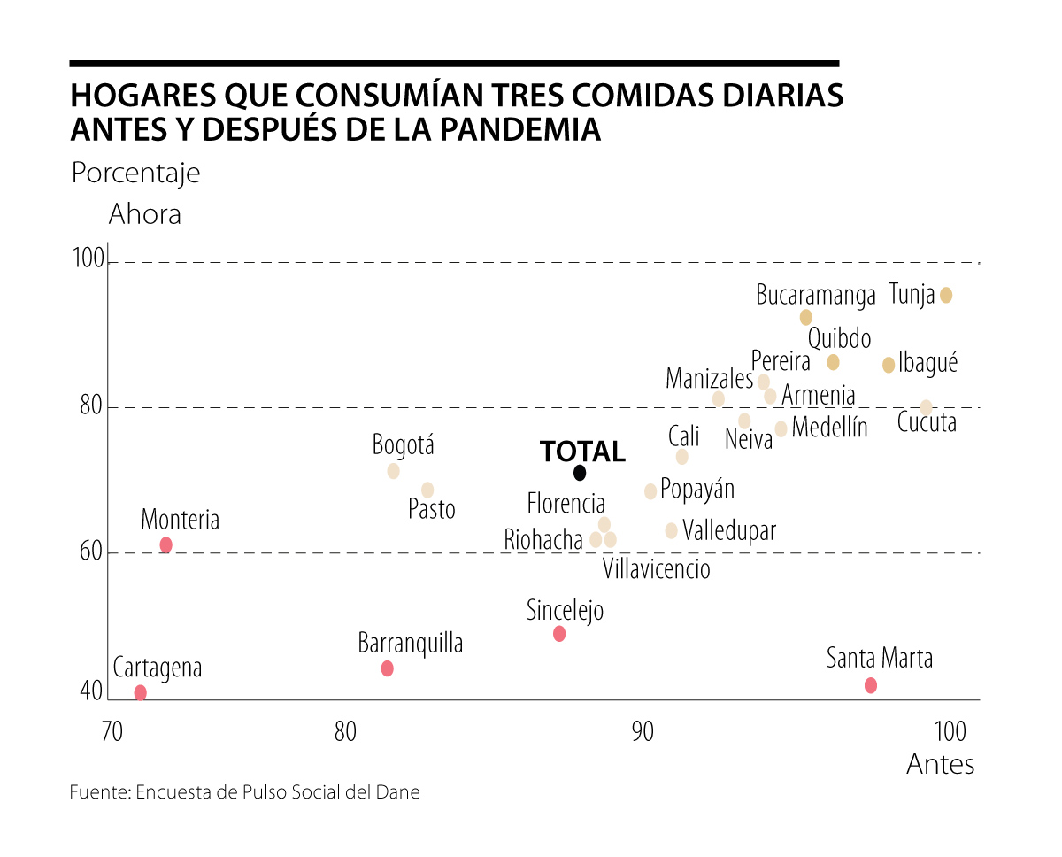 Los hogares que más han visto disminuir la cantidad de comidas diarias se encuentran en las ciudades de la región atlántica. Santa Marta ha reportado la mayor cantidad de hogares que manifiestan haber reducido su ingesta de alimentos diaria. Previo al confinamiento el 98% consumían tres comidas, mientras que en la medición de octubre solo el 41%. Cartagena pasó del 73% al 40% en ese indicador y Barranquilla del 81% al 43%. No deja de ser preocupante que, incluso antes de la pandemia, varias ciudades ya tenían porcentajes por debajo del 85% de hogares con frecuencias menores a tres comidas diarias.