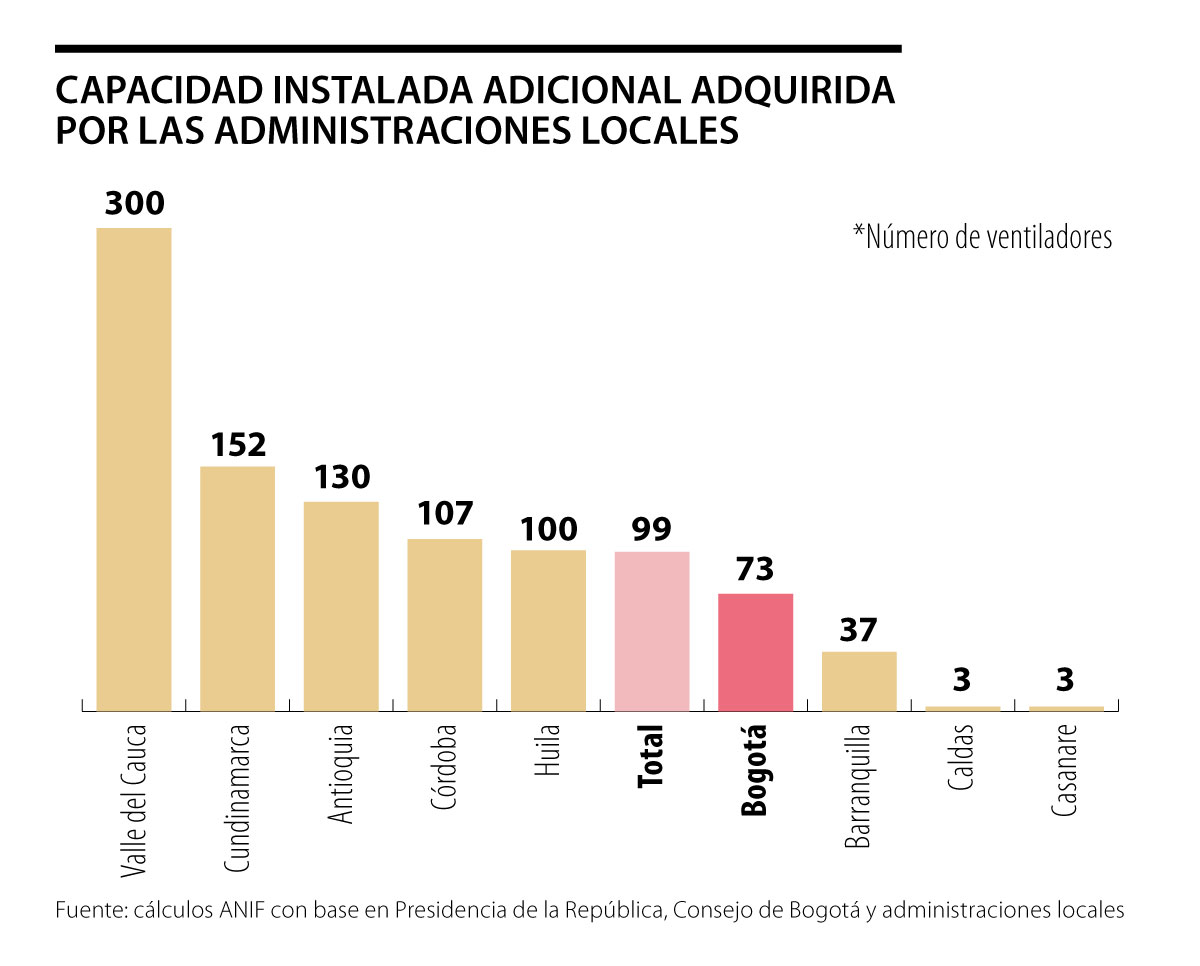 Desconcierta el bajo esfuerzo de la administración de Bogotá en términos de adquisición de ventiladores, en comparación con departamentos como Antioquia, que a la fecha logró, con recursos propios y del sector privado, multiplicar por 2.4 el número de camas UCI. Adicional a eso, resultan paradójicos los resultados en la medida en que Bogotá no solo concentra la mayor población a nivel nacional, sino que además cuenta con mayores recursos fiscales y un mayor número de camas adaptables a las funciones de una UCI. Esto demuestra que Bogotá descargó la mayoría de la responsabilidad en el Gobierno Nacional y, si no hubiera sido por el aporte del sector privado, el cambio en el número de UCI no habría sido sustancial. El aporte del Gobierno Nacional a la fecha ha sido de 300 ventiladores. Este es un punto fundamental ya que este retraso es el que, precisamente, hace que se piense de nuevo en encierros generalizados, con los altísimos costos económicos y en bienestar que los acompañan.