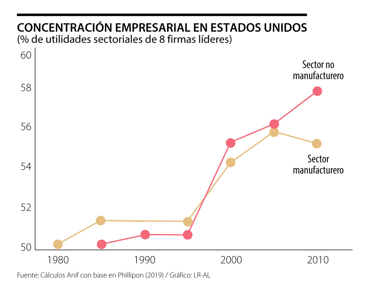 Phillipon encuentra relaciones entre esa mayor concentración y el incremento de las utilidades corporativas, las cuales han pasado de niveles del 6% del PIB durante 1962-2000 a niveles cercanos al 10% del PIB durante 2000-2017. Aún más, sus cálculos muestran que son los sectores con tendencias crecientes en su concentración los que explican esas mayores rentabilidades empresariales.