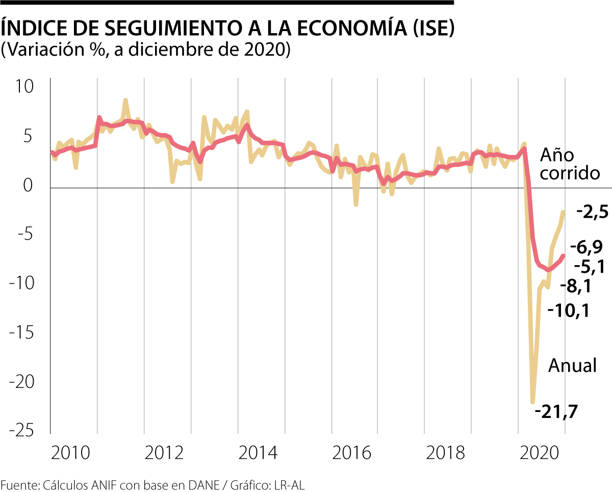 El último mes del año cerró con una caída del ISE de 2.5% (vs. un crecimiento de 3.2% un año atrás), lo que significa una expansión intermensual en la serie corregida por efectos calendario y estacionales de 1.5% (ver Gráfico 1). En el año corrido, el indicador cayó 6.9%, lo que confirma la reversión de la tendencia negativa que empezamos a observar desde noviembre. En términos generales, los números permiten afirmar que, de seguir así, la economía podría estar ya encaminada hacia una recuperación sólida, aunque más lenta de lo que se proyectaba en los primeros meses de la pandemia.
