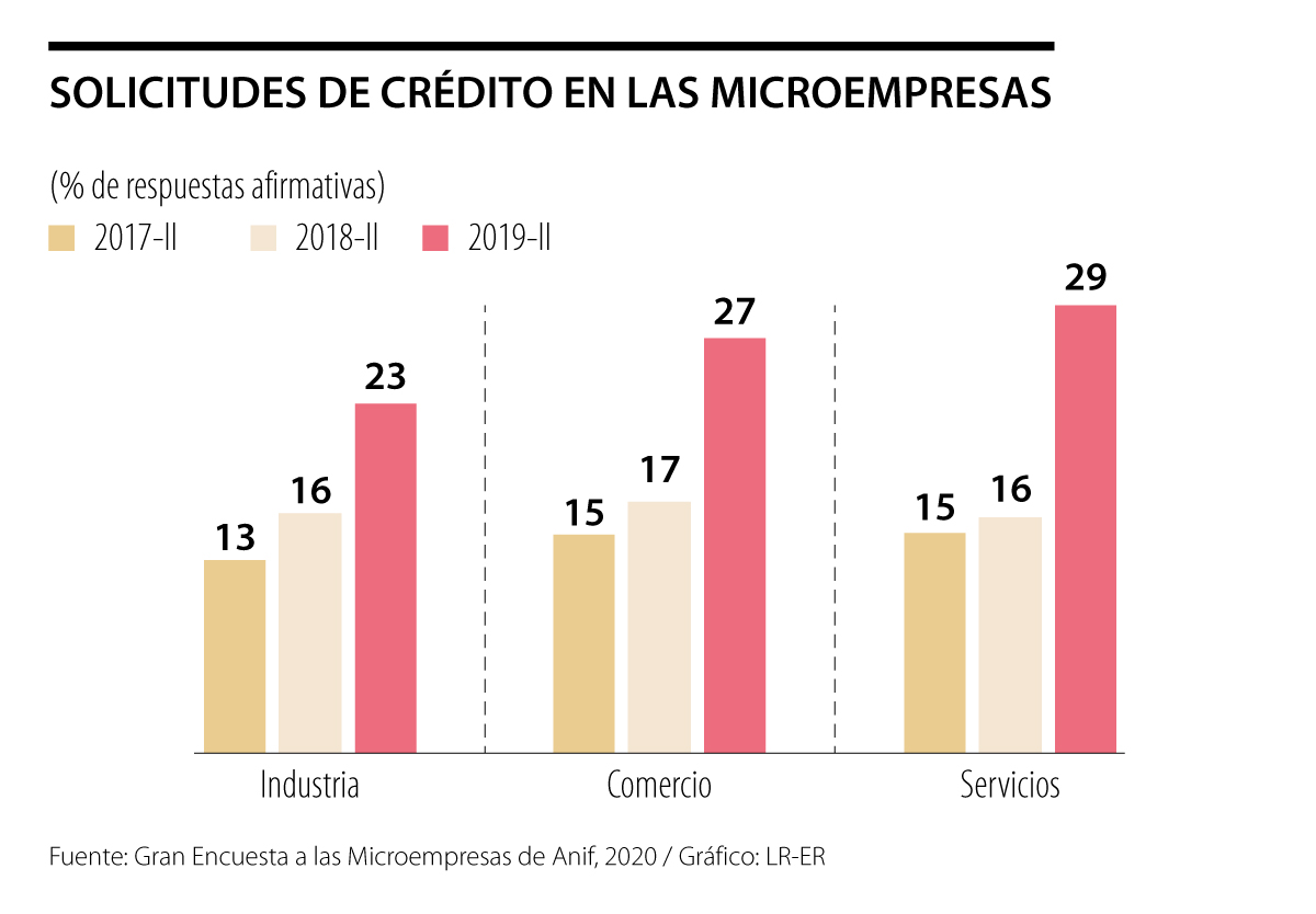 Esto es consistente con la relativa estabilidad de las tasas de mercado (por ejemplo, durante 2018-2019, la tasa efectiva del crédito de consumo y ordinario se mantuvo en niveles de 18%-19% y la del microcrédito en 37%). Curiosamente, al preguntar a los microempresarios por el rango de tasas de sus créditos, la respuesta más común fue hasta el 5% efectivo anual (con participaciones de 29% en industria, 44% en comercio y 46% en servicios), muy por debajo de los niveles tradicionales de interés bancario que se aprueban a este segmento empresarial.