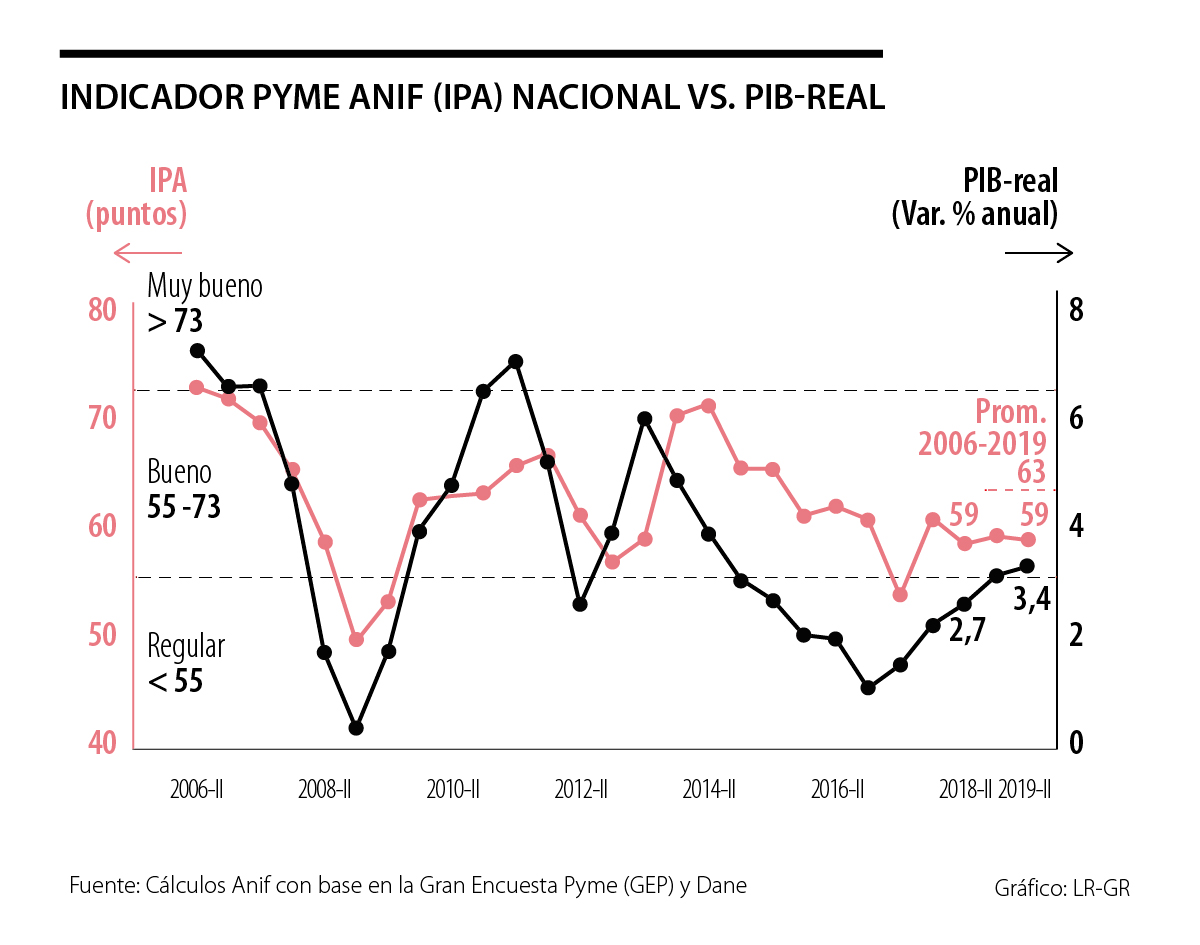 Una forma de sintetizar el desempeño de las Pyme es a través del Indicador Pyme Anif (IPA). Este resume el clima económico de las Pyme mediante la comparación de las variaciones en los índices de i) situación económica; ii) volumen de ventas; iii) expectativas de desempeño general; y iv) expectativas de ventas (estas dos últimas a un semestre vista), ver Comentario Económico del Día 6 de febrero de 2020.