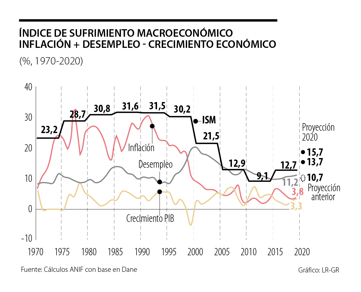 Bajo este panorama, resulta oportuno realizar un análisis del entorno macroeconómico a través del Índice de Sufrimiento Macroeconómico (ISM), definido como: (inflación + desempleo) - (crecimiento económico). En esta nota presentamos el desempeño del ISM, por quinquenios, para el período 1970-2020. Adicionalmente, presentamos nuestra proyección para 2020, considerando los retos que está enfrentando el país por cuenta de la crisis de salud pública. En todo caso, los resultados que se obtendrán en este año serán mucho mejores que los registrados en las décadas 1970s y 1980s. Los avances del ISM son notables y nos muestran que estamos en otro nivel y que la economía colombiana ha tenido una mejoría notable en los últimos 20 años.