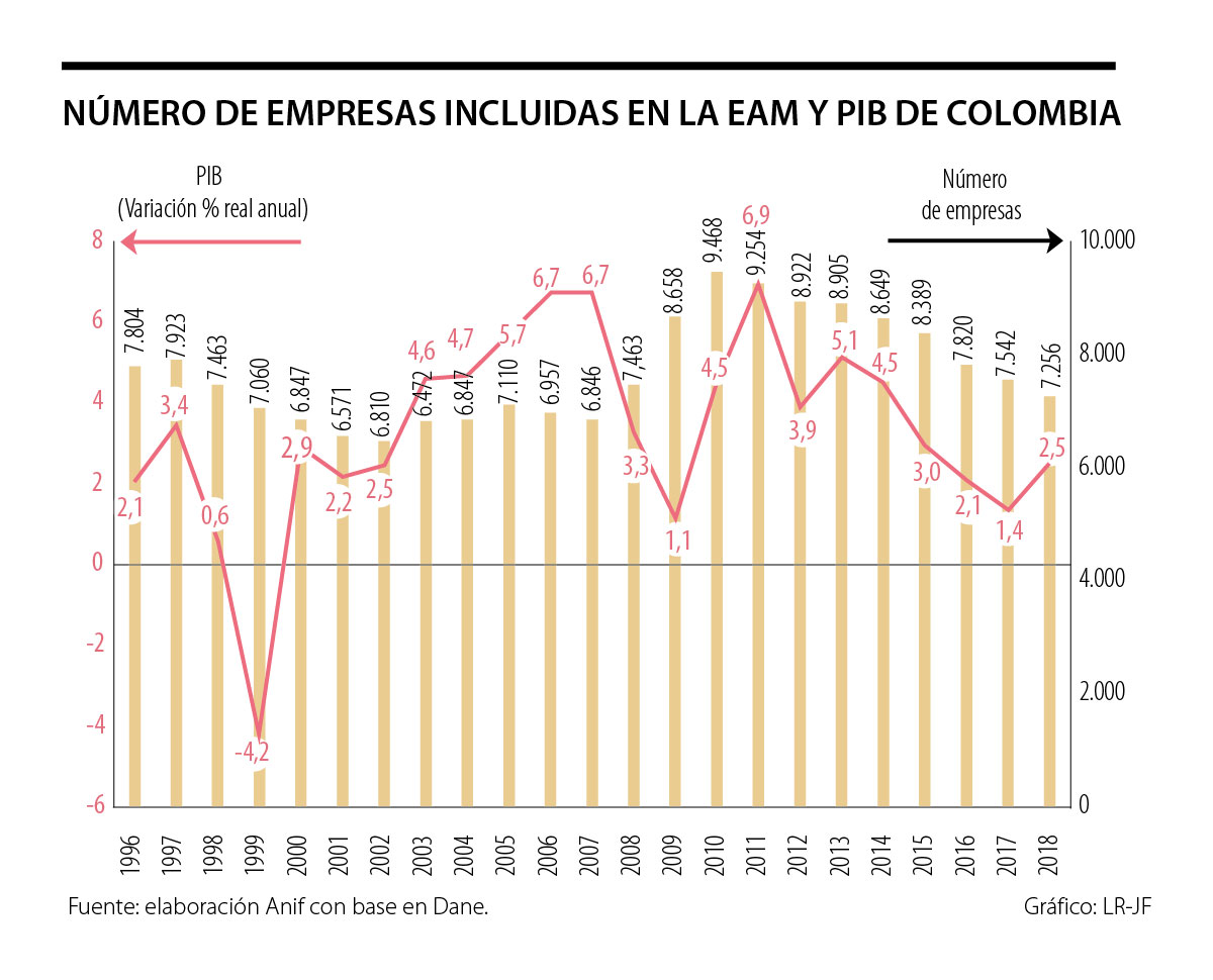 Nos preguntamos cómo podemos analizar los efectos económicos de largo plazo y nuestra respuesta, parcial, es que la historia de la crisis de 1999 podría ofrecer indicios importantes. Así, en este Comentario Económico utilizaremos información de la Encuesta Anual Manufacturera (EAM) del Dane para analizar la evolución de las empresas industriales en la crisis de 1999 para tener un referente. Aunque nuestro análisis se limita a la industria manufacturera, este sector es de gran importancia, pues emplea 12% del total de ocupados y genera 13% del valor agregado (PIB).