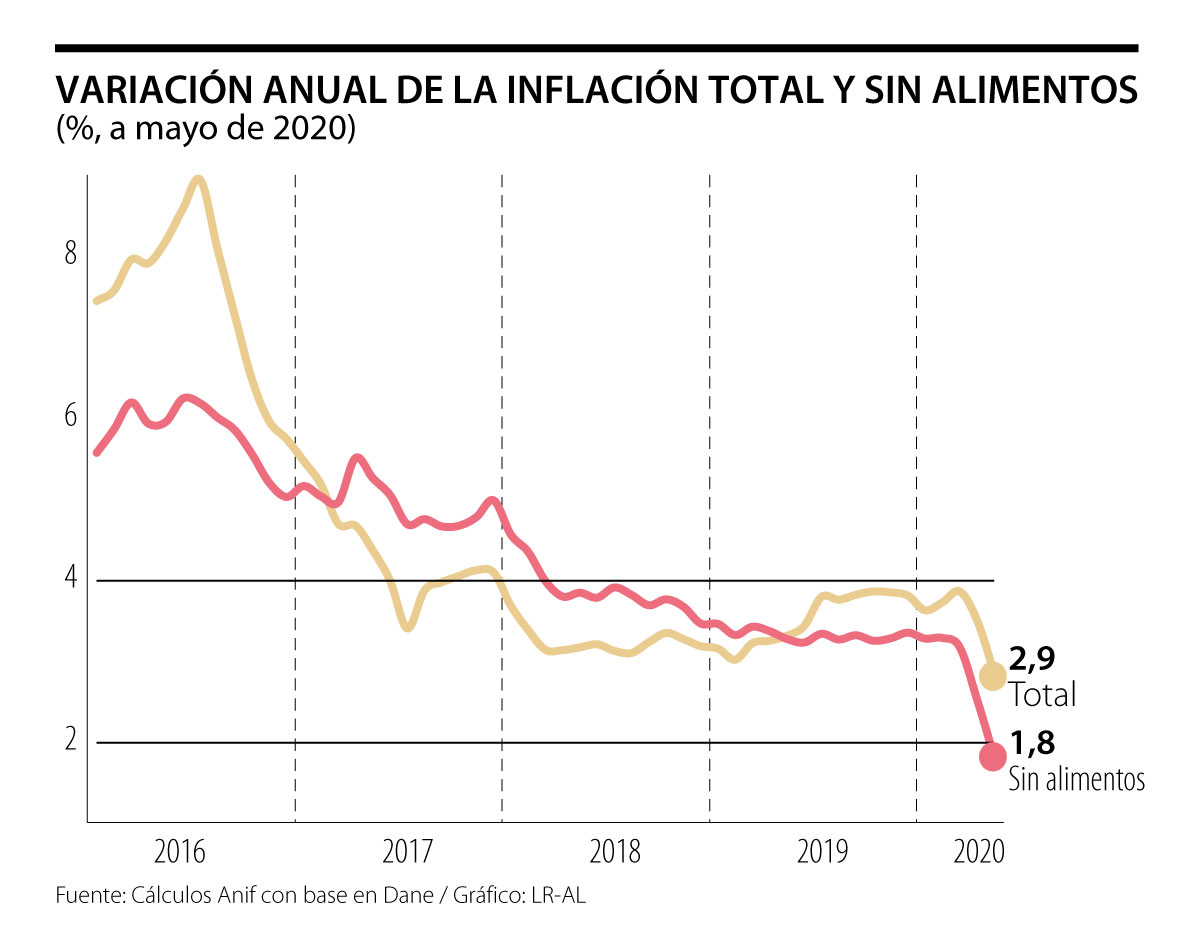 El viernes, el Dane reportó que la variación mensual del IPC fue negativa en mayo de 2020 y se ubicó en -0,32%, significativamente por debajo de lo esperado por el consenso del mercado (0,1%) y del resultado de mayo de 2019 (0,31%).