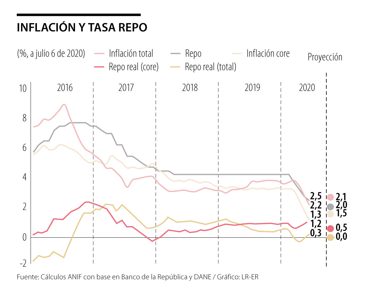 ANIF considera que esas señales de debilidad en la actividad económica podrían dar espacio a reducciones adicionales en la tasa repo del Banco de la República (BR) en lo que resta de 2020, de manera que al cierre del año se ubique en niveles del 2% (completando recortes por 225pb vs. los actuales 175pb). Esto implica llevar la tasa repo real a valores expansivos entre el 0%-0.5% a finales de 2020 (ver Gráfico 2).