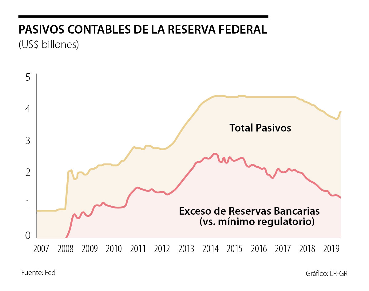 Recordemos que, desde octubre de 2017, el Fed venía desmontando sus paquetes de compras de activos, incluso reduciendo su tenencia de tesoros al dejar cumplir sus vencimientos. Esa menor demanda por bonos públicos debió ser reemplazada por mayor absorción de los “creadores de mercado” (principalmente bancos), lo cual, por principios básicos de contabilidad, venía reduciendo el nivel de los llamados “excesos de reservas bancarias”.