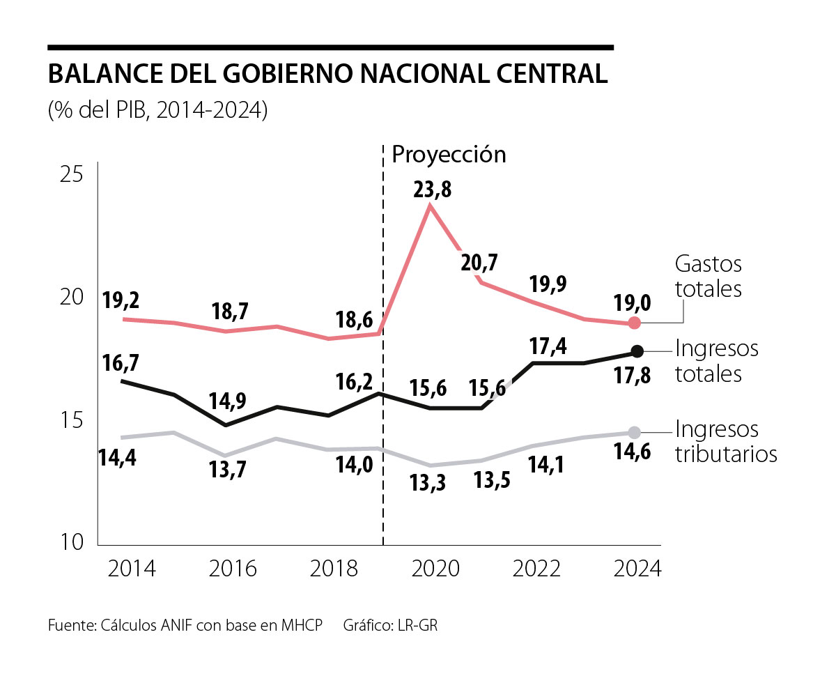 Ese rápido ajuste del déficit se alcanza, en opinión del MHCP, porque se logran dos objetivos que hoy parecen muy optimistas: (i) mayores ingresos tributarios, que estarían aumentando de 13.3% del PIB en 2020 al 13.5% en 2021 y al 14.1% en 2022, al suponer una rápida aceleración del crecimiento económico y mejoras sustantivas en la lucha contra la evasión-elusión tributaria, como consecuencia de la consolidación del proceso de modernización de la DIAN; y (ii) menores necesidades de gasto, una vez superada la pandemia, corrigiendo desde el 23.8% del PIB en 2020 al 20.7% en 2021 y al 19.9% en 2022.