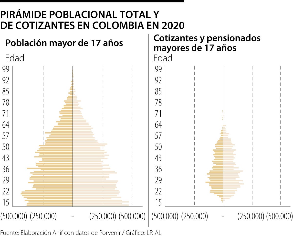 Adicionalmente, es necesario entender que el RPM está diseñado para que las mesadas de las personas que cumplen con los requisitos para pensionarse actualmente se financien con los aportes de los cotizantes actuales. En términos simples, los jóvenes financian las pensiones de los más viejos. Sin embargo, eso supone un problema estructural adicional, pues el sistema fue diseñado cuando la pirámide poblacional en Colombia permitía concebir un régimen de ese estilo, es decir, dónde la base de aportantes (jóvenes) era mucho más amplia que el número de adultos mayores (Gráfico 2a). En ese orden de ideas, la pirámide ha cambiado con el paso de los años, haciendo que la base de cotizantes se vuelva insuficiente a futuro para cubrir las mesadas de todas las personas que se pensionarán. Si analizamos únicamente la pirámide teniendo en cuenta la población que efectivamente cotiza (Gráfico 2b) encontramos que, desde sus inicios, el RPM estaba destinado a fracasar, pues la base de aportantes no era tan amplia como se esperaba debido a la baja proporción de cotizantes.