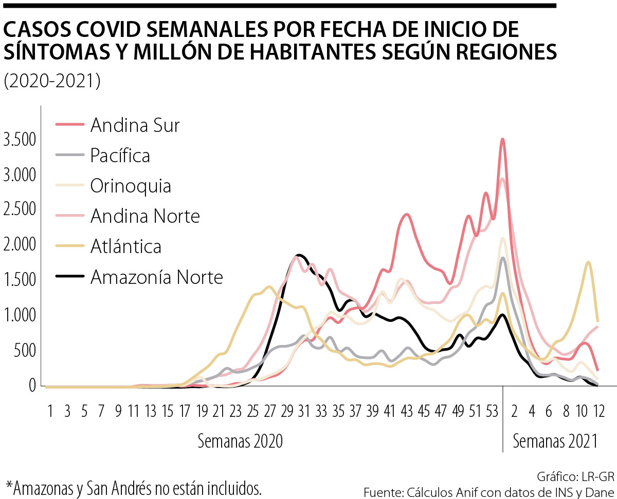 Empezamos revisando los casos por fecha de inicio de síntomas para cada una de las regiones. En el Gráfico 1, se observa que para 2021 el repunte de casos se ha dado principalmente en dos regiones.2 En el primer caso, la región Caribe tuvo su pico en la semana 111. Mientras que la región Andina Norte muestra un ascenso progresivo de casos.