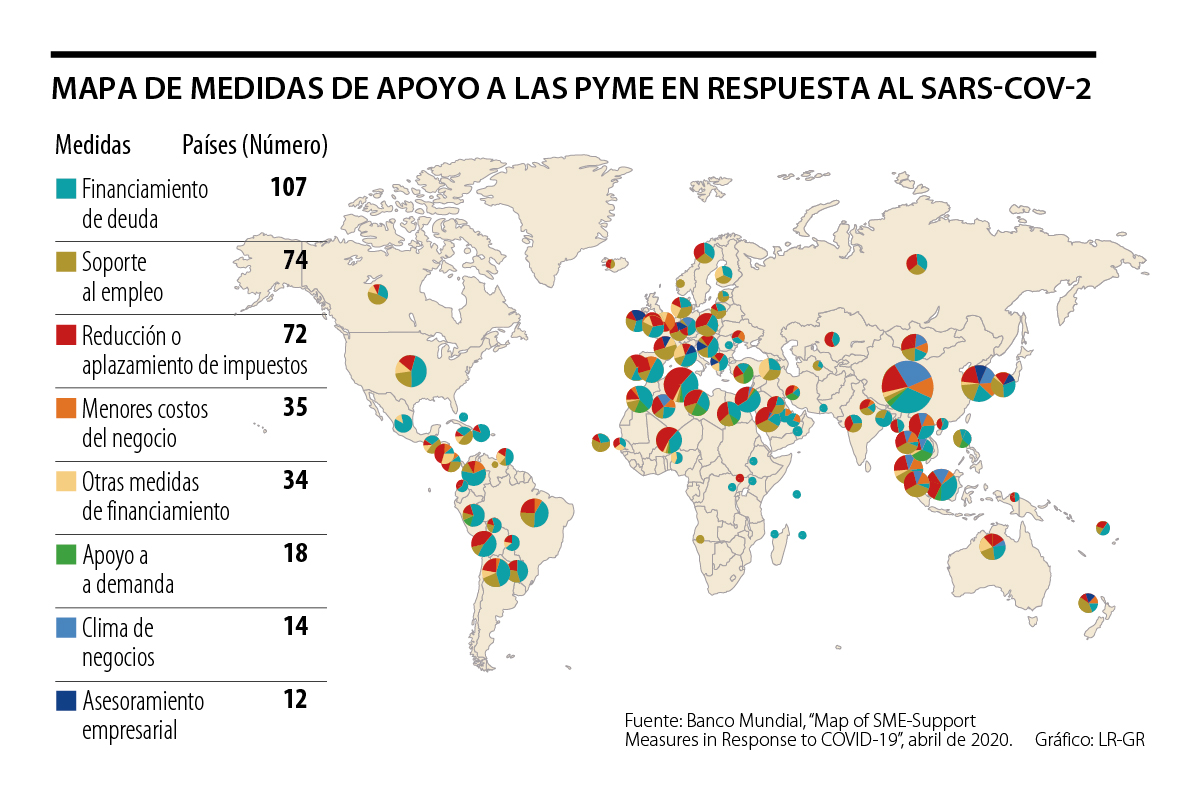 A nivel global, el impacto negativo del SARS-CoV-2 sobre la economía tuvo como consecuencia la implementación de diversas medidas de apoyo a las empresas (especialmente para las Mipymes), con el objetivo de sobrellevar esta coyuntura y prepararse para una progresiva recuperación económica. El gráfico adjunto muestra cómo esas medidas se concentraron principalmente en: (i) financiamiento de deuda (aplicado en 107 países al corte de abril de 2020); (ii) soporte al empleo (74 países); y (iii) reducción o aplazamiento del pago de impuestos (72 países).
