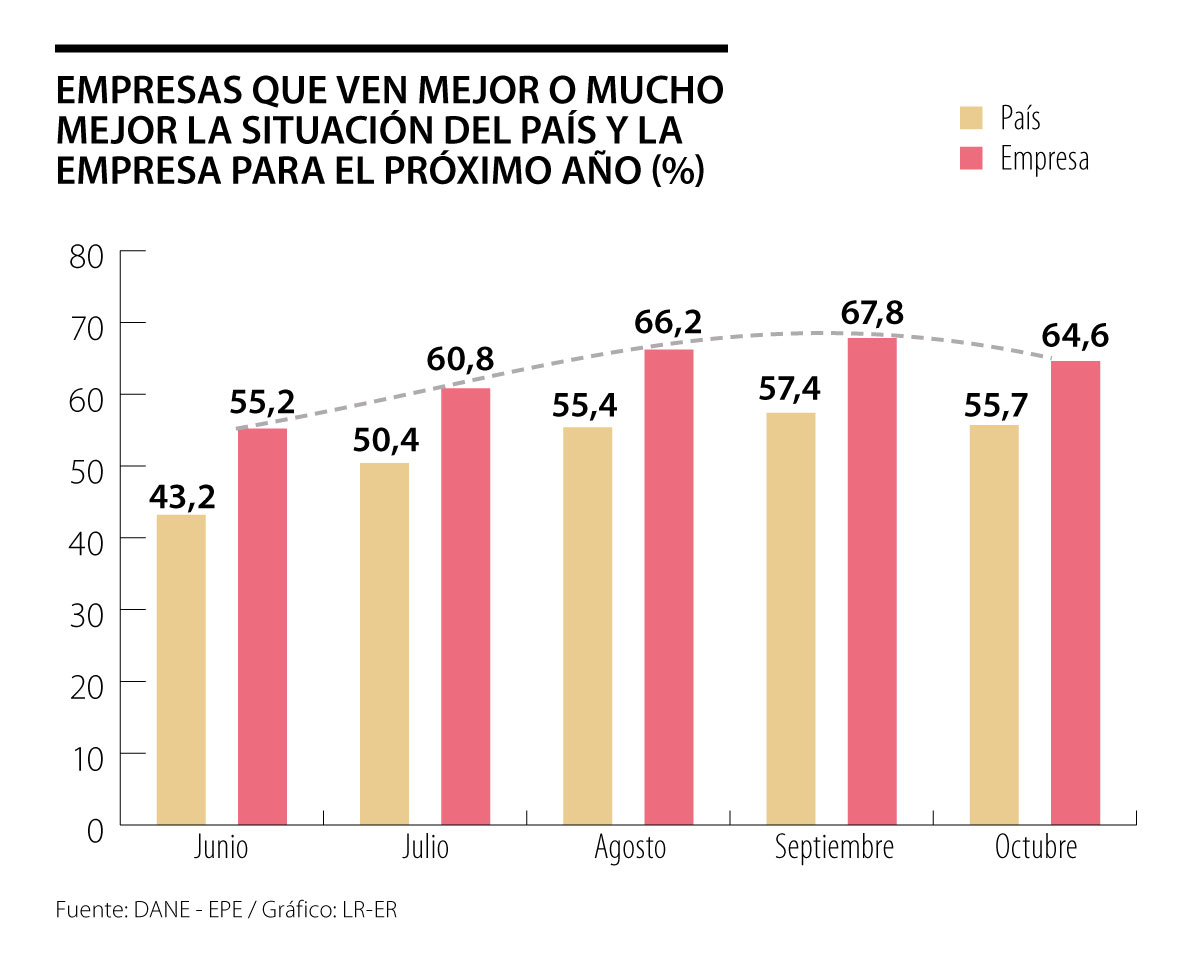 Adicionalmente, el porcentaje de encuestados que ven mejor o mucho mejor la situación del país y de sus empresas para el próximo año, que venía en