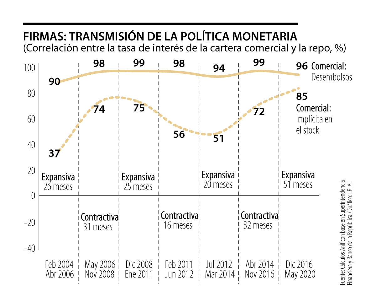 Un análisis del BR1 , en el que evalúan la transmisión de la tasa de política monetaria a las tasas de interés de captación y crédito, encontró que, en efecto, existe una relación de largo plazo entre esas dos variables. En el corto plazo, la velocidad de transmisión de la tasa de referencia es mayor en el caso de los créditos comerciales (55% del total) que en el caso de los préstamos dirigidos a hogares (45%).