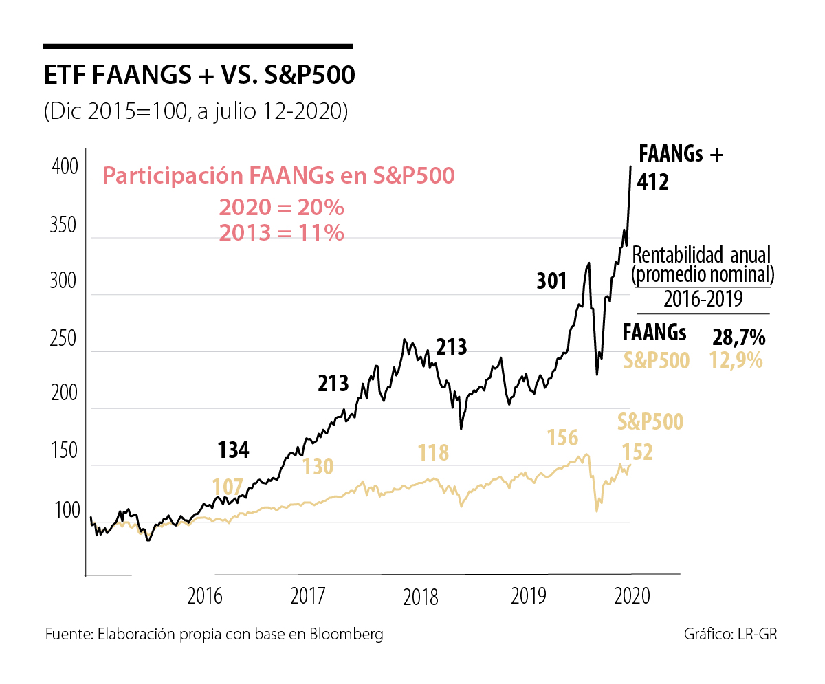 Dichas narrativas también han intensificado la preexistente sobrevaloración de las grandes empresas de tecnología americanas (Faangs + Microsoft), cuyos múltiplos descuentan escenarios “perfectos” de explotación de rentas monopólicas prospectivas en las economías de capital intangible (con evidentes ventajas en la tendencia creciente de e-commerce y tele-trabajo en cuarentenas, ver gráfico). Ello ha implicado una tendencia algo extraña, donde el otrora elemento defensivo de los mercados son ahora esas grandes tecnológicas, dependiendo el pivote hacia los elementos cíclicos del apetito por riesgo y la potencial recuperación en salubridad-economía. Todo esto ha exacerbado las brechas en la tendencia de sobre desempeño de los factores de “crecimiento” (growth) vs. apuestas de “valor” (value, hoy con elevadas coincidencias en elementos cíclicos de sector financiero, industrial y similares).