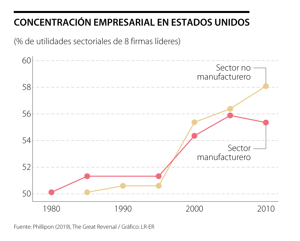 Tampoco puede atribuirse a ese mecanismo SH-C las usuales increpancias de concentración empresarial (ver Phillipon, 2019) o tendencia decreciente en remuneración factor trabajo en Estados Unidos (más ligadas a poder de negociación-sindicatos, ver Summers y Stansbury, 2020), ver gráfico.