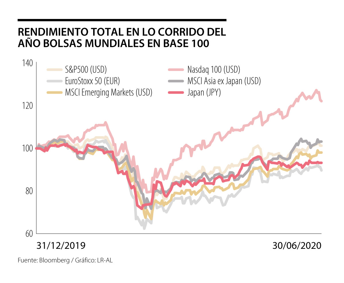 Así mismo, desde el mínimo alcanzado el 23 de marzo, las bolsas a nivel global han vivido una recuperación sin pausa, pero desigual y selectiva. Los principales índices estadounidenses ya se encuentran levemente positivos en lo corrido del año, liderados por el tecnológico Nasdaq con ganancias de 20%, pero otras regiones como mercados emergentes y Europa medidos a través de los índices MSCI Emerging Markets y el EuroStoxx 50 aún presentan pérdidas de -3% y -7%, respectivamente.