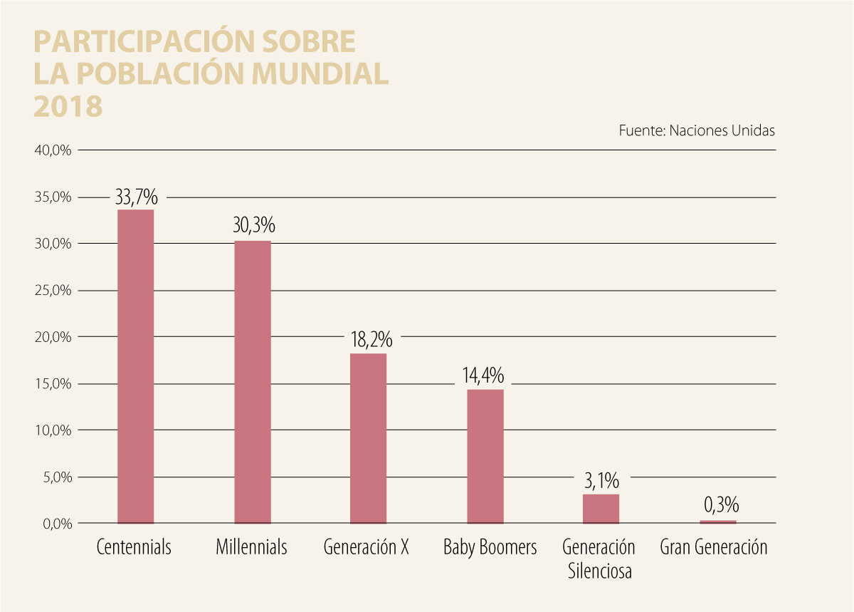 Hoy en día convivimos seis generaciones, la gran generación (1915 - 1927), la generación silenciosa (1928 - 1945), los baby boomers (1946 - 1964), la generación X (1965 - 1980), los famosos millennials (1981 - 1997) y, por último, los centennials o generación Z (> 1997). En consecuencia, se crean diferentes sucesos. Por ejemplo, se estima que en los próximos 30 años en EE.UU. la generación X y los millennials heredarán cerca de US$ 30 billones provenientes de los baby boomers, los cuales son considerados como la generación con más riqueza en la historia. Seguramente el uso de estos recursos tendrá un impacto.