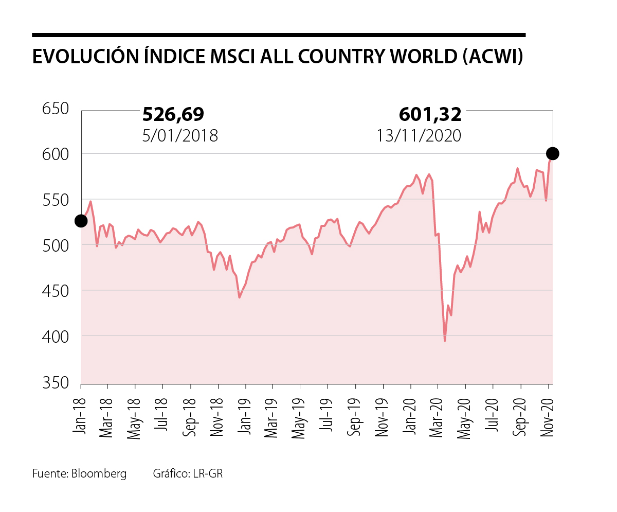 Faltan 49 días para que finalice 2020 y aún existe una alta incertidumbre de como finalizará el año. Sin embargo, noviembre ha resultado un excelente mes para los activos de riesgo en general. Las principales bolsas del mundo han logrado borrar las pérdidas de los dos últimos meses y se encuentran cotizando cerca de sus máximos históricos. El índice Msci All Country World, el cual muestra el comportamiento de la renta variable de 23 economías desarrolladas y 26 emergentes en conjunto- alcanza una valorización de 9% en el mes y de 8% en lo corrido del año.