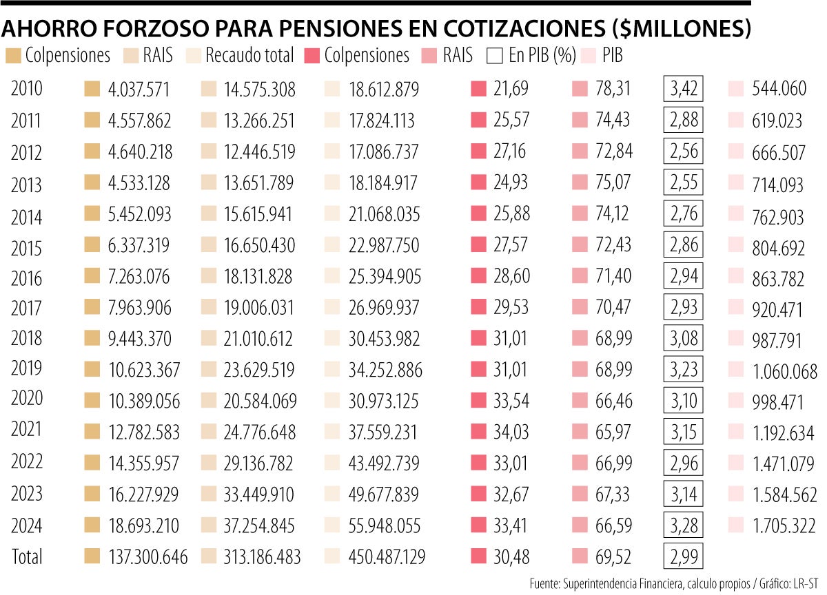 Dos tendencias se reflejan en los últimos quince años: i) el lento incremento del ahorro forzoso en el PIB, de un mínimo de 2,55%, en 2013, se llega a 3,28% en 2024, para un promedio de 3% anual, y ii) la mayor participación de Colpensiones en el recaudo, desde 21,7% hasta 33,4%.