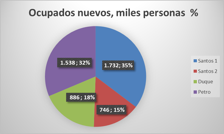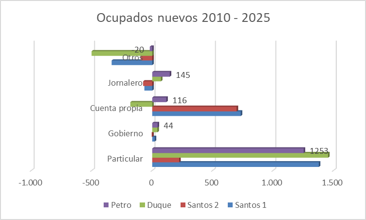 Por periodo de gobierno (gráfica 1), el mayor volumen de nuevos puestos de trabajo, 1,7 millones le correspondió al primer periodo Santos, entre 2010 y 2014, a un promedio de 425.000 por año, le sigue en volumen al actual periodo Petro, tres años transcurridos entre 2022 y 2025, con 1,5 millones y promedio de 500.000 por año. El gobierno Duque es el tercero, son 886.000 en el cuatrienio y finaliza Santos con su segundo periodo y 746.000 en los cuatro años.