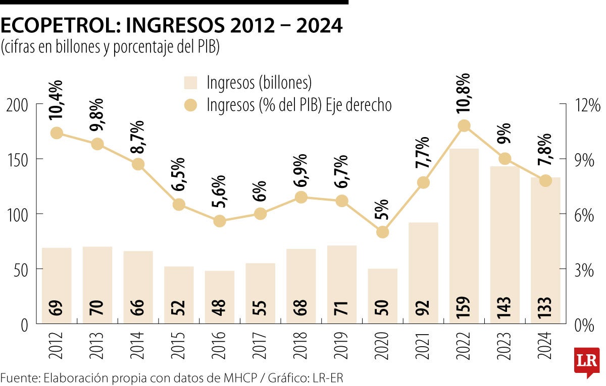 Los años de mayor proporción en el PIB se explican por dos razones: i) ingresos extraordinarios producto de buenos precios internacionales del crudo, como en 2012 cuando el barril estuvo en US$112 y hubo una producción elevada de 944.000 barriles diarios, kpbd; y ii) liquidación excepcional del Fepc, como en 2022 cuando el Gobierno pagó $37 billones producto del mayor incremento del precio internacional de los combustibles, acompañado de otro precio excepcionalmente alto de crudo (US$99 el barril) y una relativa buena producción de 754 kpbd.