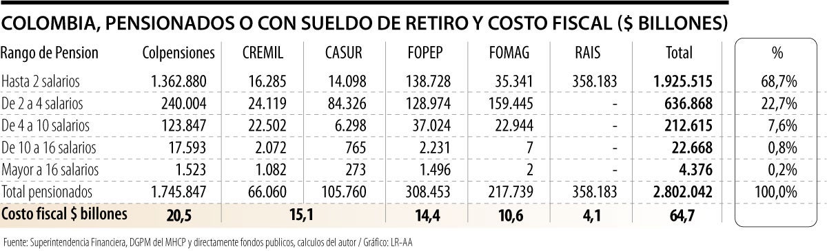 El costo fiscal de los pensionados de Colombia corresponde a los aportes del presupuesto general de la Nación para cubrir mesadas. Ese costo fiscal, contabilizado en $64,7 billones en 2024, refleja tres situaciones: