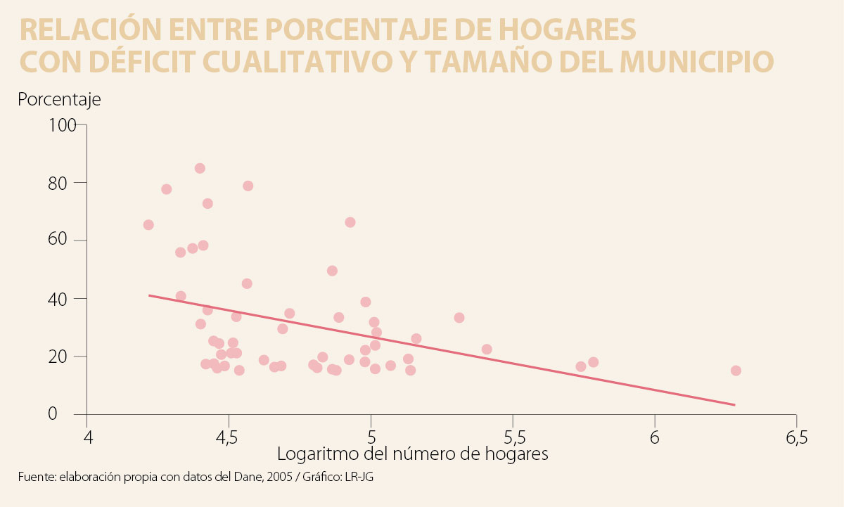 Las tasas de déficit habitacional no son uniformes en el sistema de ciudades al interior de un país. Los datos de Colombia permiten observar la relación negativa entre el tamaño de la ciudad y el porcentaje de viviendas que sufren déficit cualitativo.