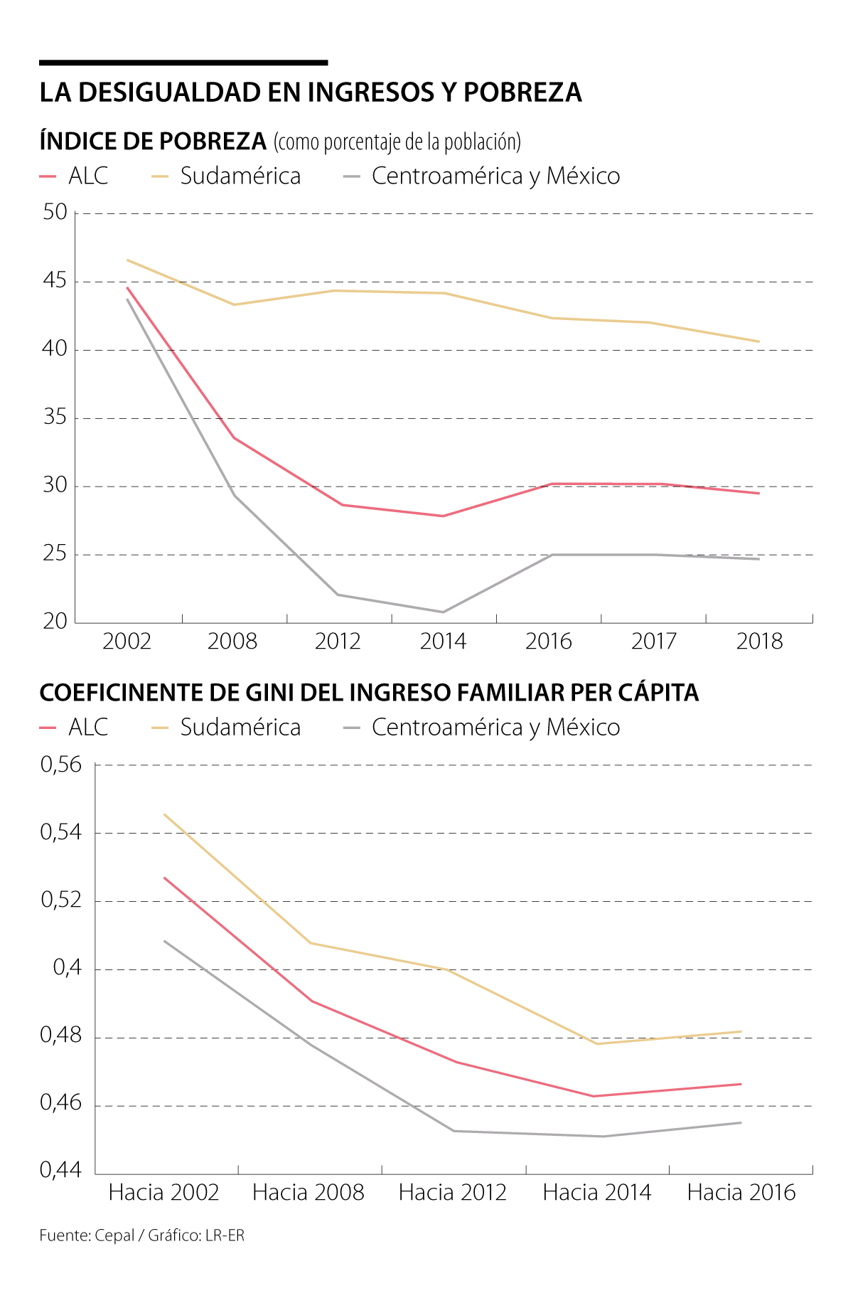 Según la Cepal (ver gráfico), observamos que la desigualdad de ingresos registró una disminución sin precedentes entre 2002 y 2014, en 2016, la desigualdad aumentó ligeramente por primera vez desde 2002, con una heterogeneidad considerable entre países. El crecimiento económico latinoamericano ha sido insuficiente y ha retrasado la reducción de la pobreza y de la desigualdad del ingreso. Además, si se considera el crecimiento de la población, es probable que el número de personas que viven por debajo de la línea de pobreza y pobreza extrema de sus respectivos países aumente aproximadamente en un millón.