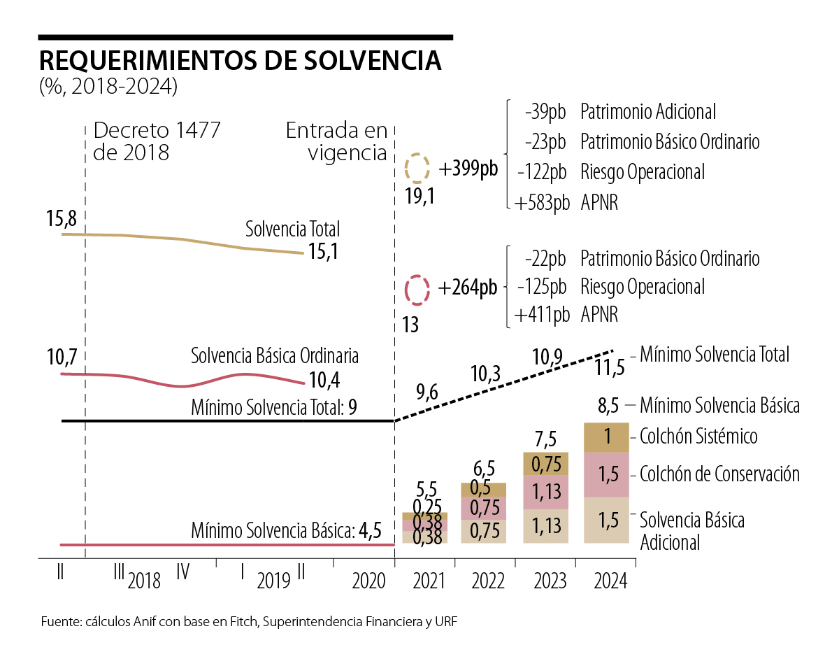 Esas modificaciones tendrían efecto sobre los balances bancarios de enero de 2021 en adelante. Los bancos tendrán un plazo de 4 años (2021-2024) para ajustar sus niveles de solvencia a esta nueva normativa (ver gráfico adjunto). Dichos cambios regulatorios estarían llevando los requerimientos de solvencia básica ordinaria al 8.5% (= 4.5% de la regulación actual +1.5% de solvencia básica adicional +1.5% de colchón de conservación +1% de colchón sistémico). Los requerimientos de solvencia total llegarían al 11.5% (8.5% de solvencia básica +3% de solvencia adicional).