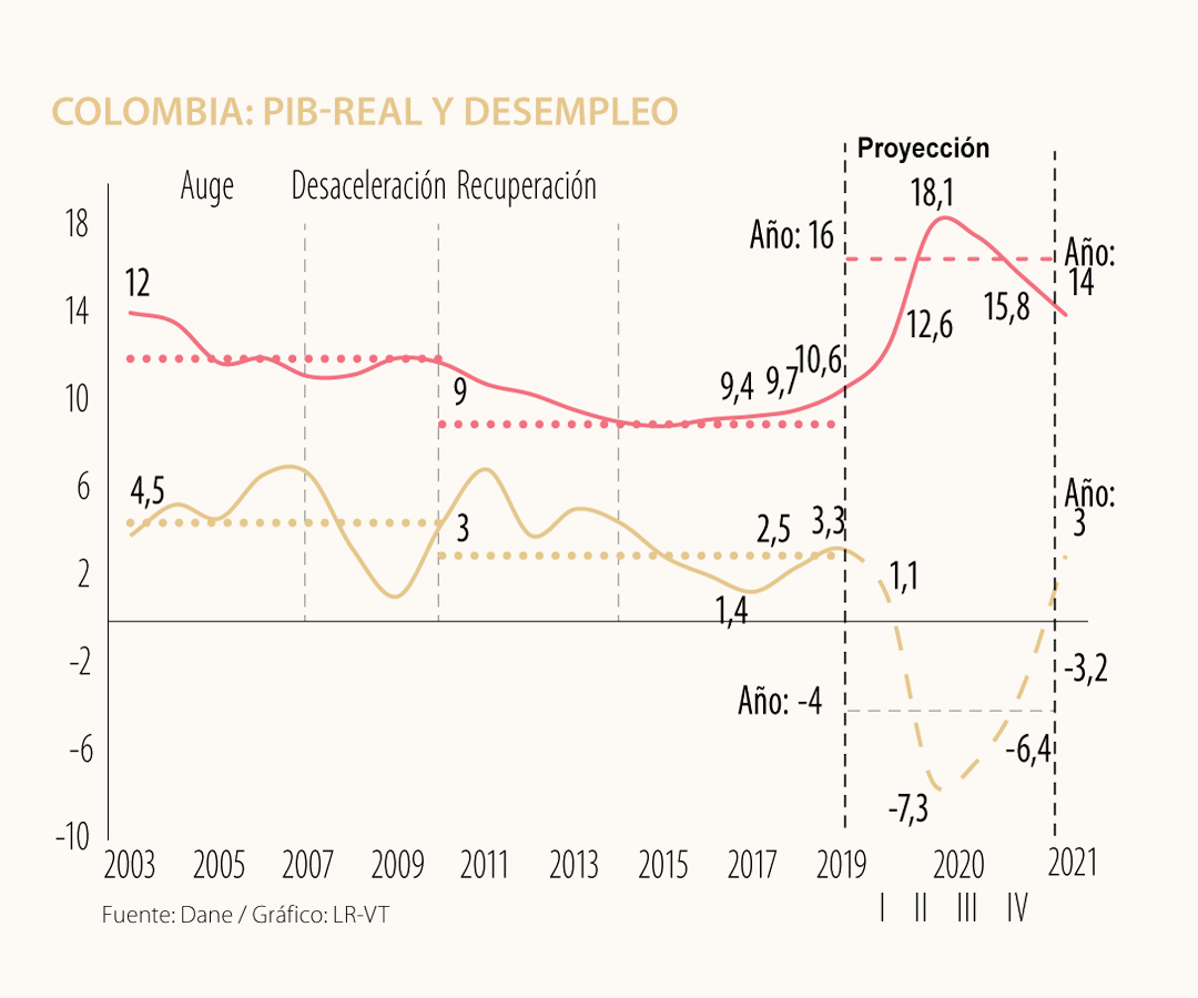En Colombia, ya teníamos una tendencia alcista en el desempleo, elevándose de 9% hacia el 11% durante 2015-2019. El pronóstico de consenso apunta hacia un 16% en promedio durante 2020 (ver gráfico adjunto). Ahora bien, si ajustamos por efectos de caída en participación laboral (según lo antes explicado), en realidad se tendría 20% en promedio durante 2020 (sabiéndose que la cifra de abril fue un penoso 23% a nivel urbano).